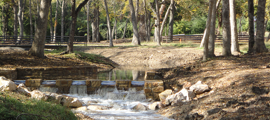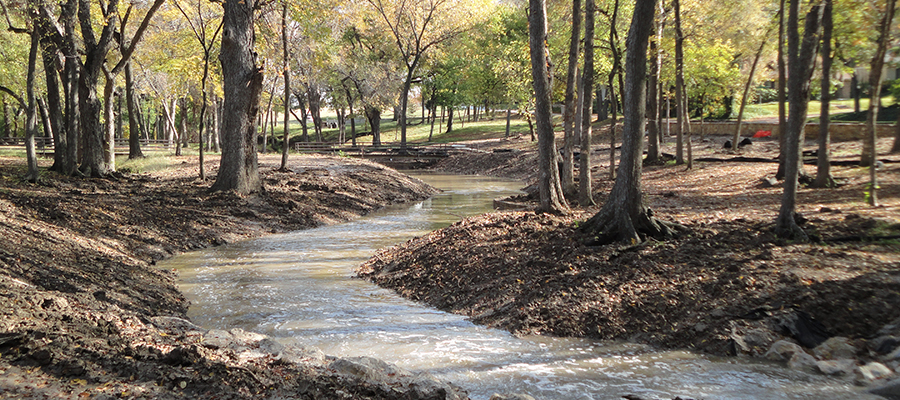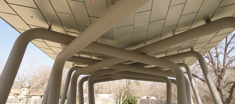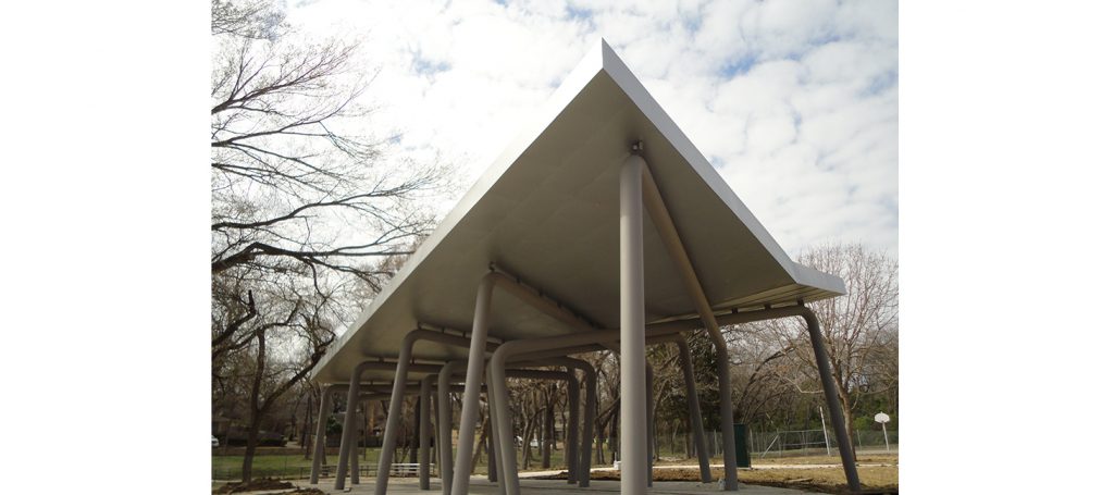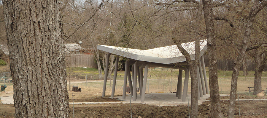 Outdoor architectural pavilion and creek water control system. The pavilion consisted of a large multiple gate and column system supporting a clad metal panel ceiling and TPO roof. The creek construction included spill ways, check dams, and tree wells along a creek leading into White Rock Lake in Dallas.